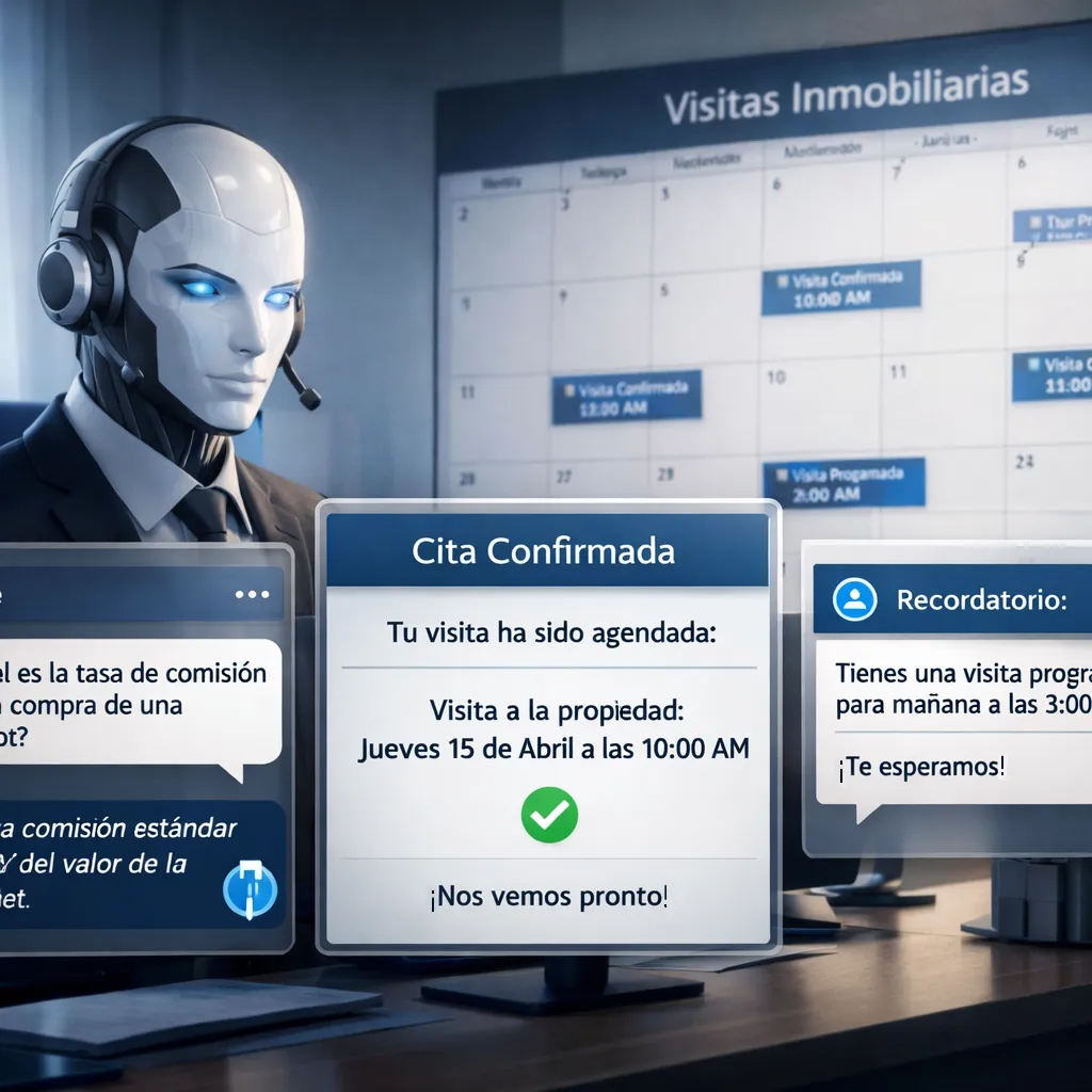 Nuestros Agentes de IA para WhatsApp y chat web atienden consultas de propiedades 24/7, filtran compradores y arrendatarios serios, y agendan visitas en tu calendario mientras duermes.
